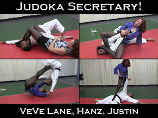 In this video, VeVe portrays the secretary of a judo school. As she closes the studio for the night, she discovers that two men are still training. She politely requests that they stop for the night, but they refuse and even throw her a few times to make their point!